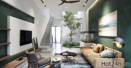 Ngôi nhà ống đẹp xây dựng theo lối kiến trúc hiện đại với giếng trời, nội thất và tường trang trí màu xanh, mang lại vẻ đẹp thân thiện, gần gũi. Với lối kiến trúc mang tính chuyển tiếp, các bức tường được trang trí màu xanh ngọc bích để…